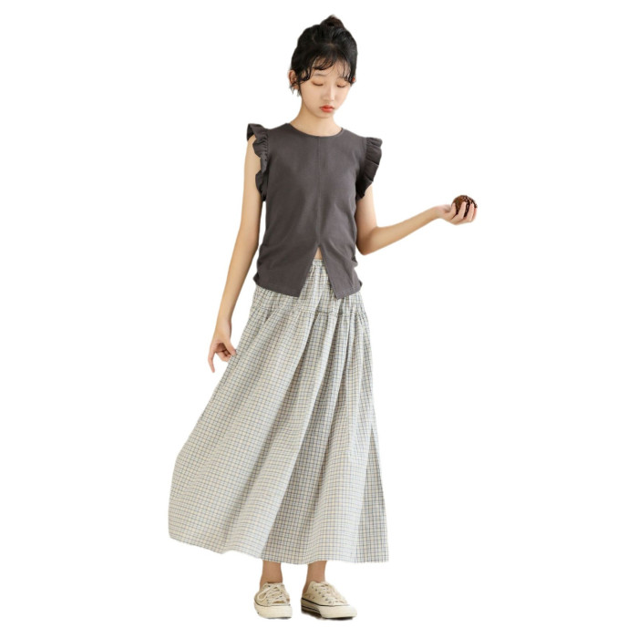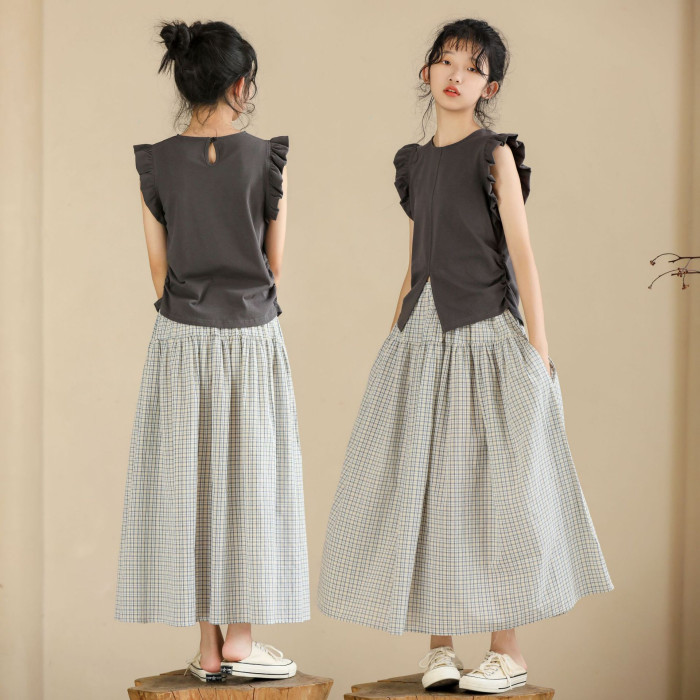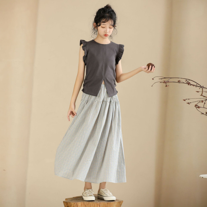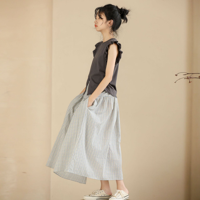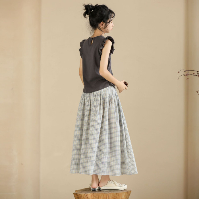 灰色飛邊袖上衣+復古藍格半身裙