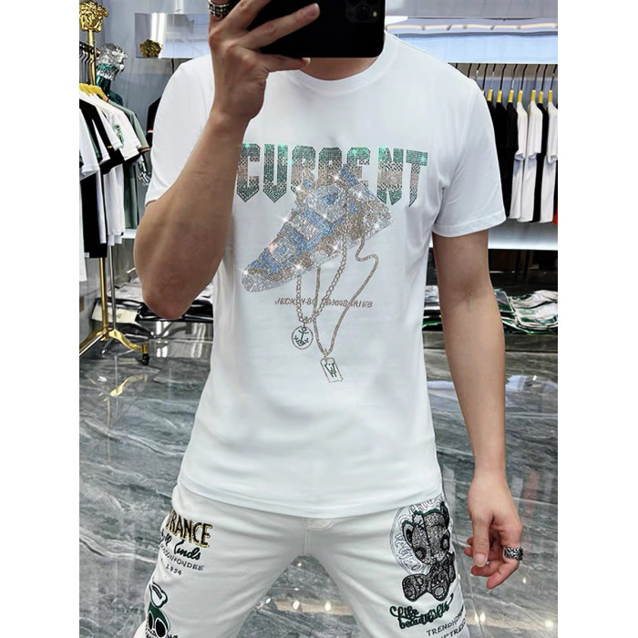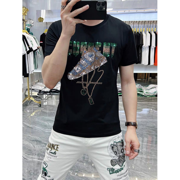 2023新款潮流字母鞋子燙鑽短袖男t恤夏冰絲光棉個性帥氣半袖