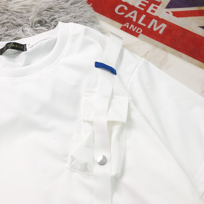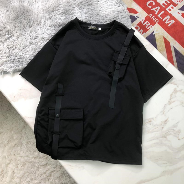 T設計感口袋飄h帶短袖男t恤夏季港風潮流寬松bf百搭純色五分袖上