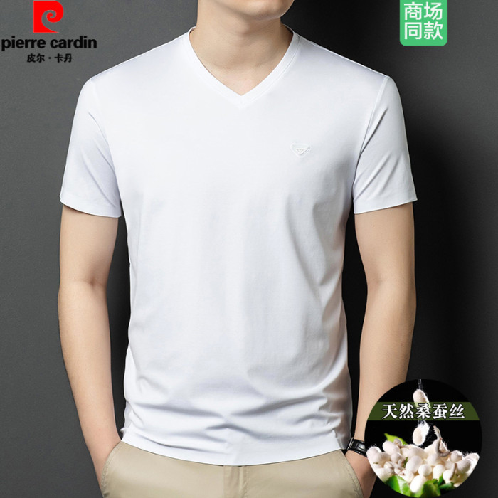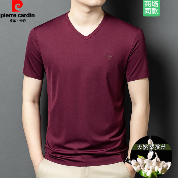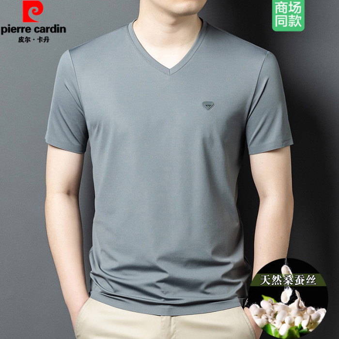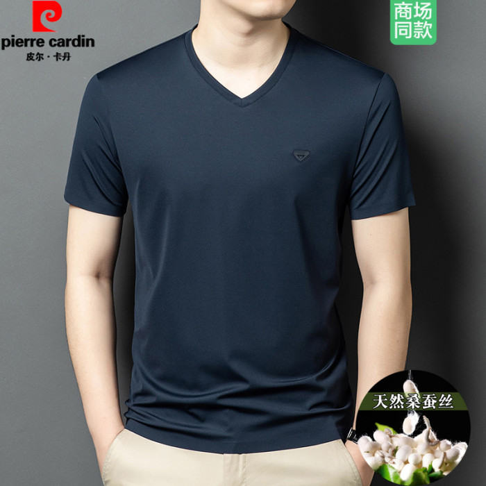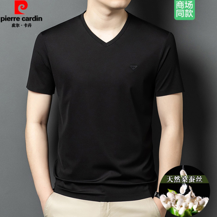 皮爾卡丹V領時尚休閒簡約純色短袖男T恤桑蠶絲夏季高檔半袖上衣薄