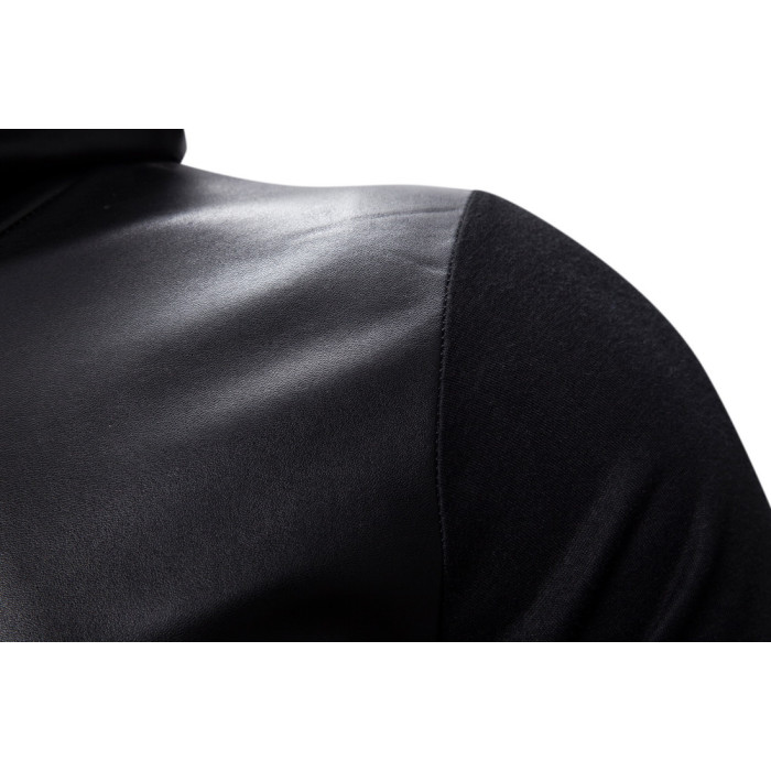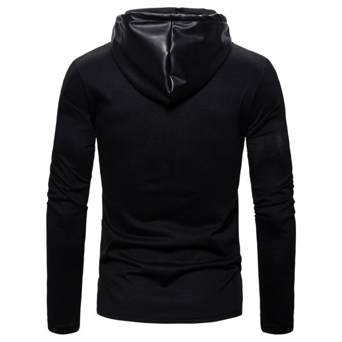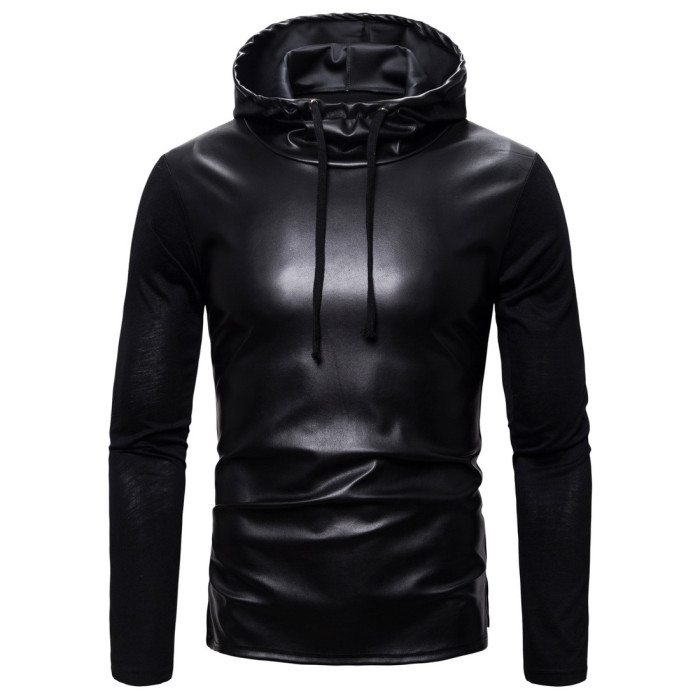 秋長袖拼皮T恤潮牌男裝大碼修身連帽潮流黑色皮衣男t恤搖滾打底衫