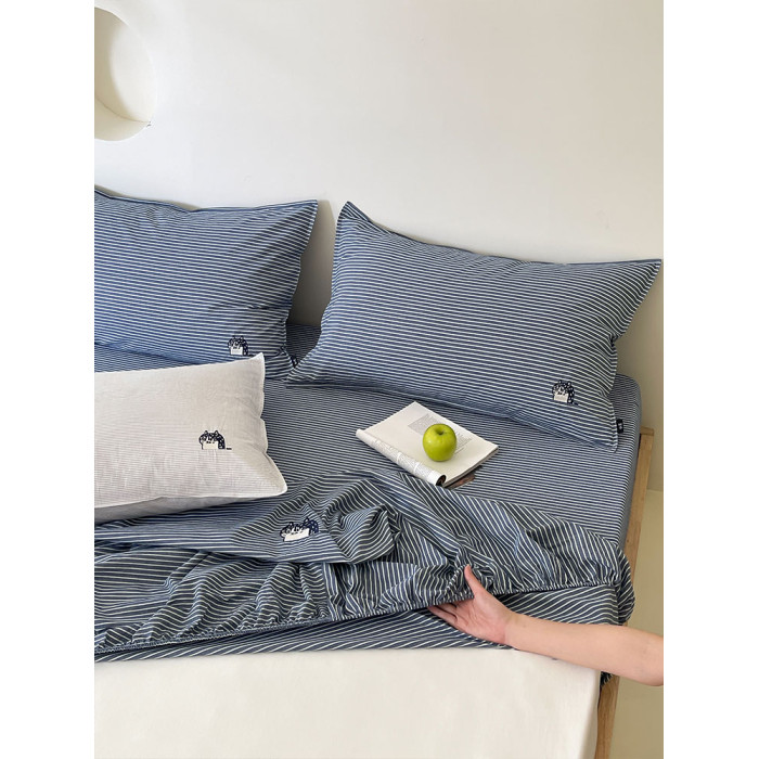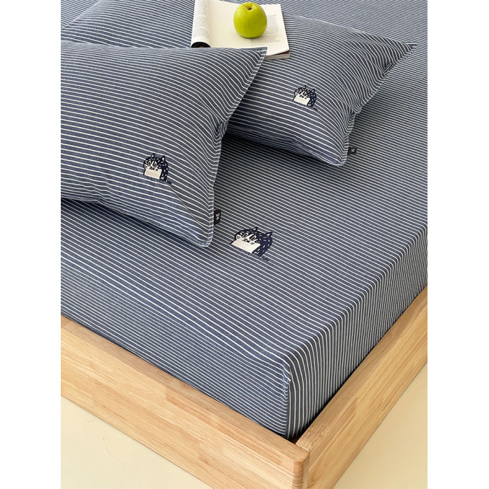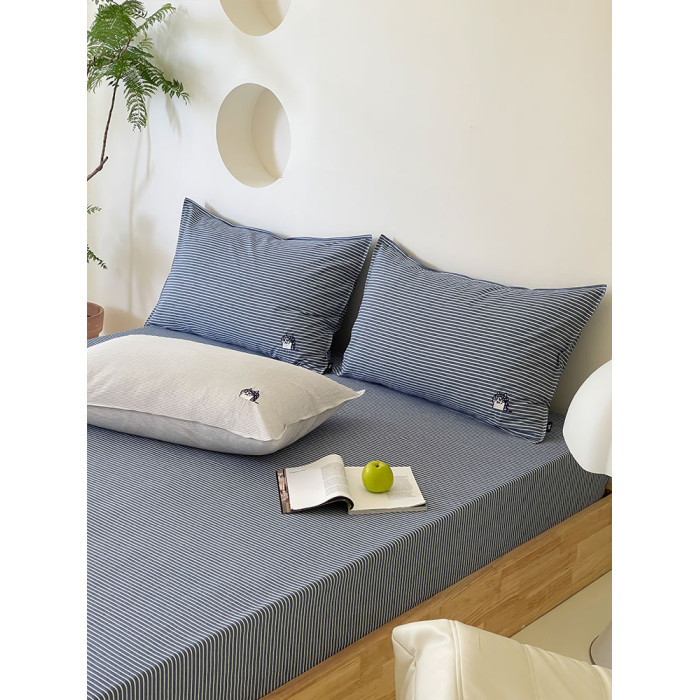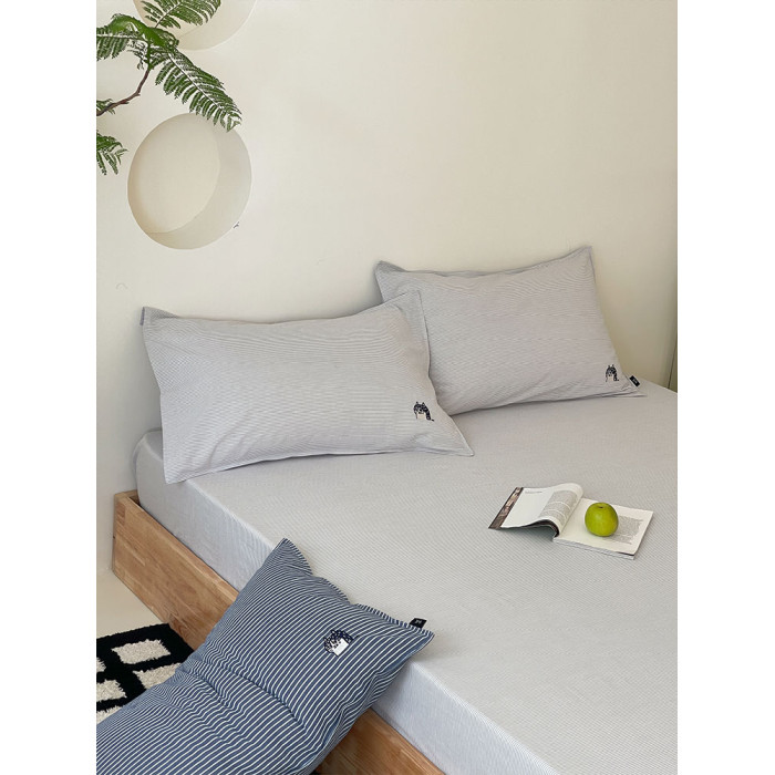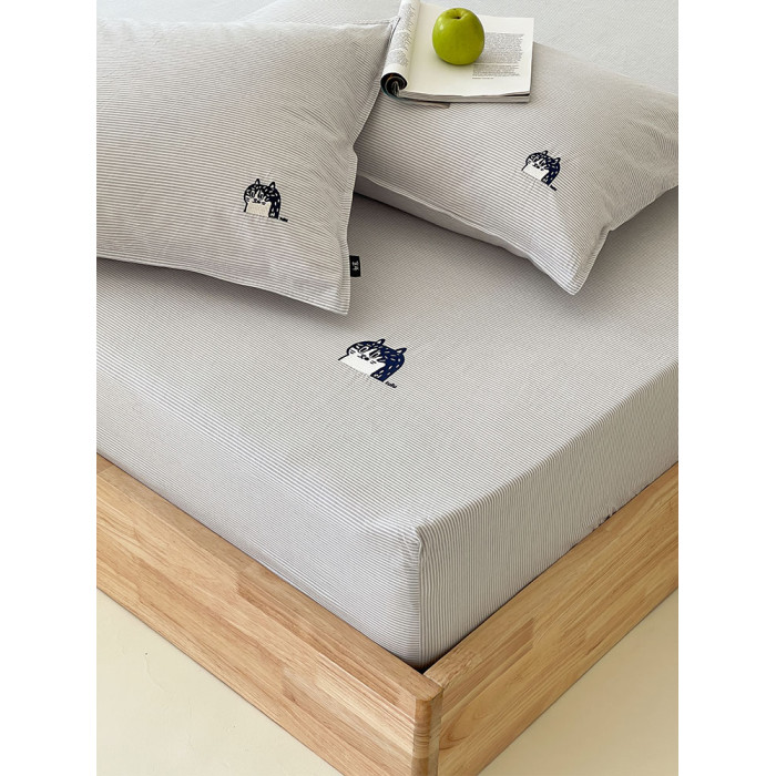 春夏全棉色織水洗全棉床笠貓咪綉花麻感春夏枕套單件如茉原創設計
