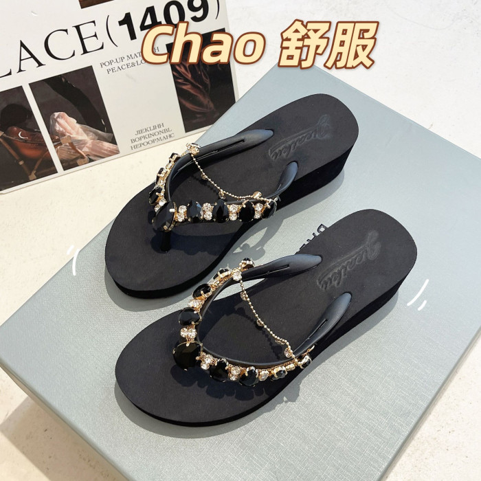 2024夏季新款ins水鑽人字拖女外穿厚底坡跟沙灘度假夾腳涼拖鞋