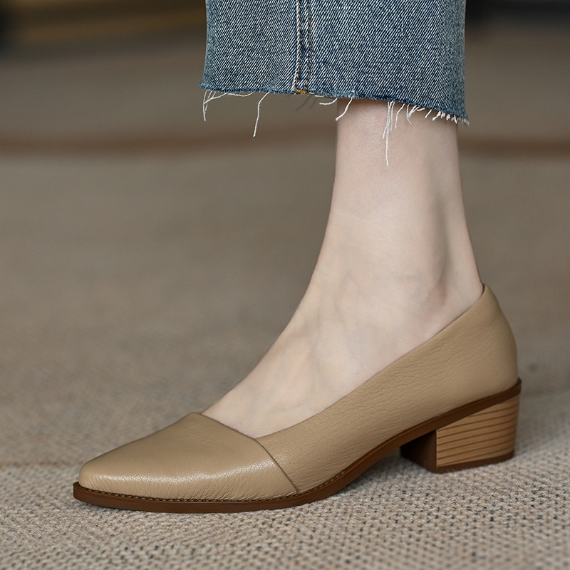 M先生 尖頭單鞋女2023年新款粗跟軟羊皮法式淺口中跟杏色女高跟鞋