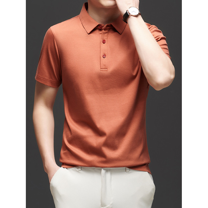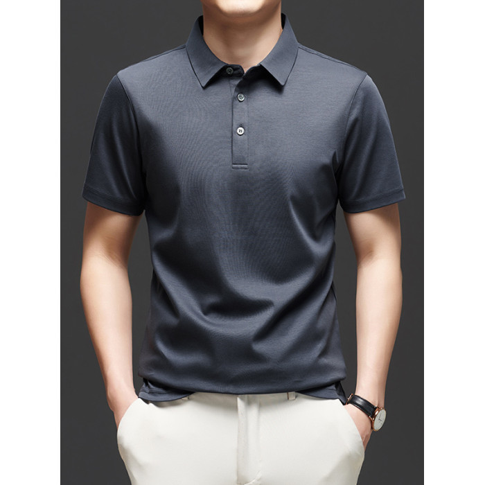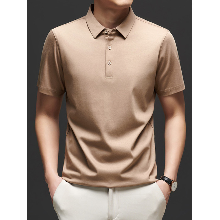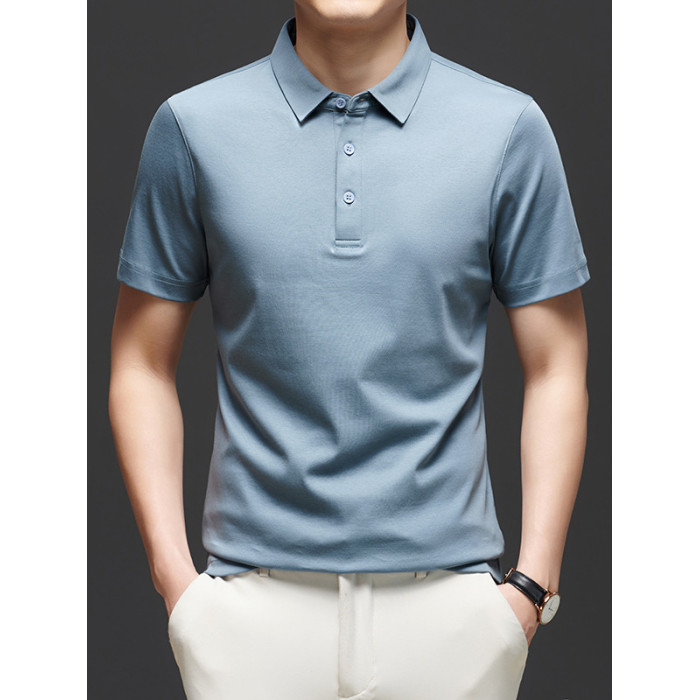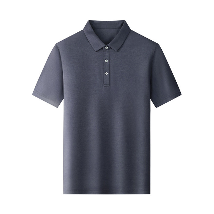 100支液氨絲光棉長絨棉夏季襯衫領翻領涼感商務休閒短袖純色男T恤