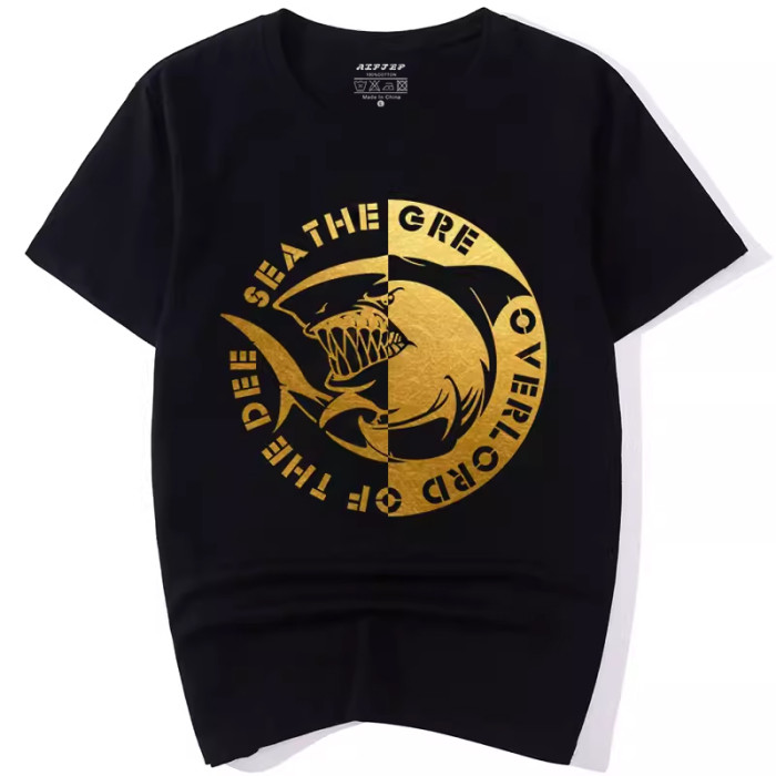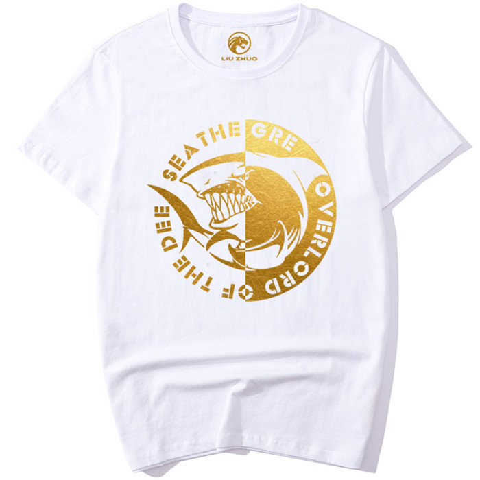 明星同款歐美街頭潮牌個性短袖燙金鯊魚圖案大牌潮男T恤大碼男裝