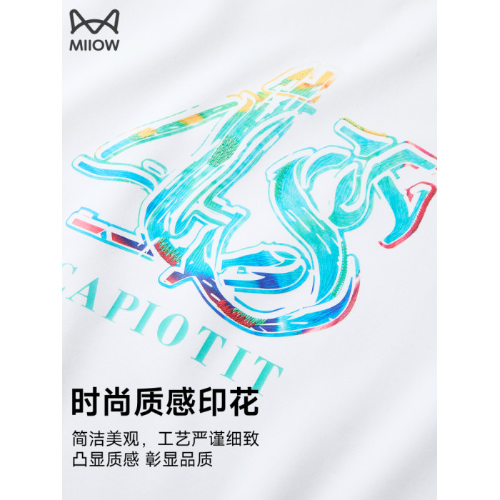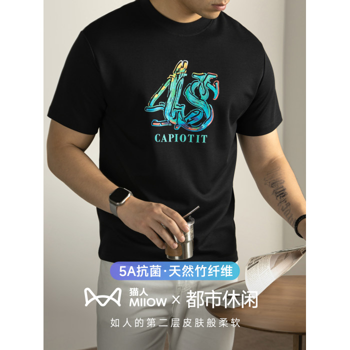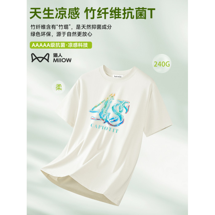 貓人涼感透氣240g竹纖維短袖男T恤夏季質感印花上衣薄款寬松圓領