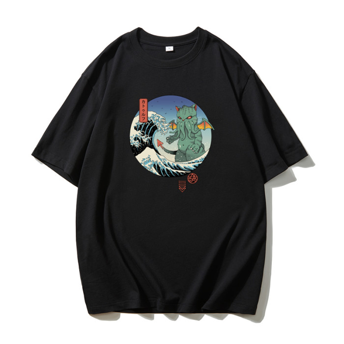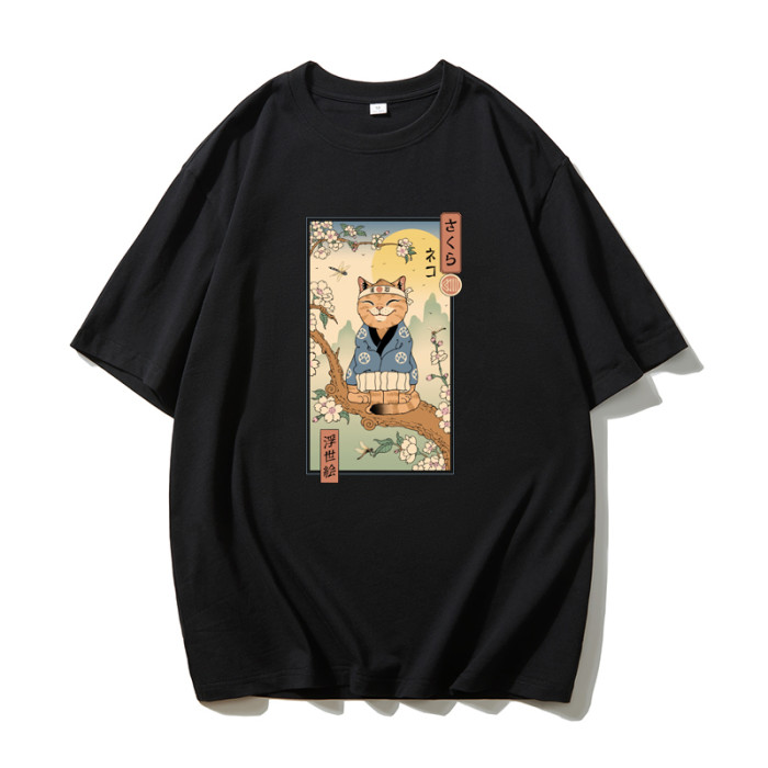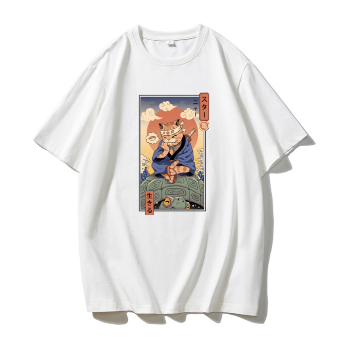 日式復古純棉男T恤浮世繪貓咪神龍龜卡通印花原宿風大碼夏季短袖