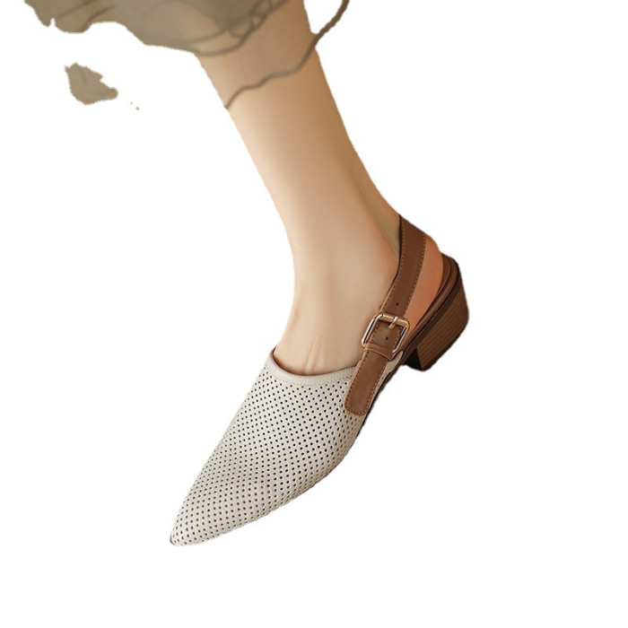 2025夏粗跟涼鞋女透氣飛織包頭小香風一字帶粗跟尖頭中跟網面女鞋