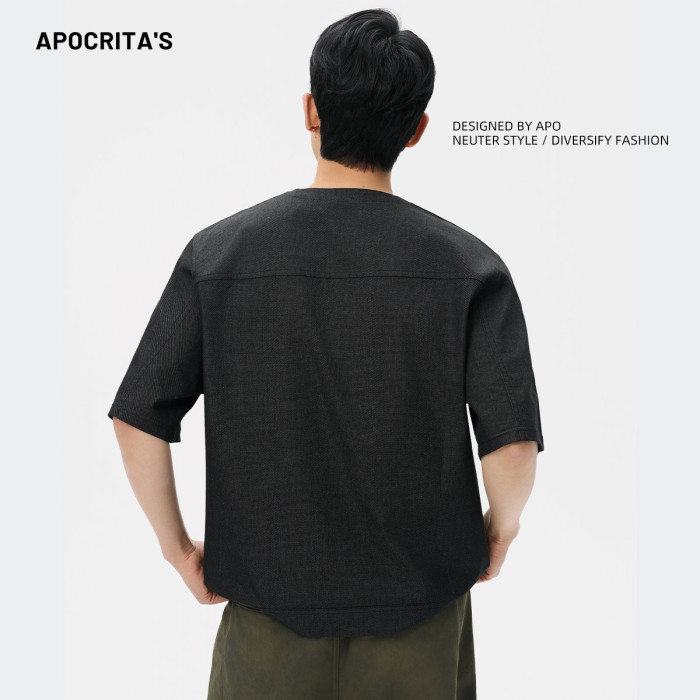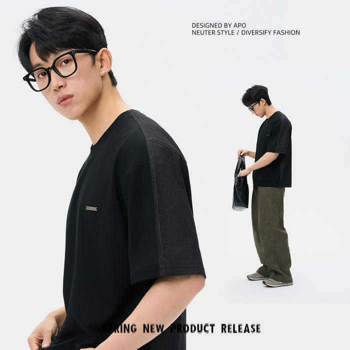 APO男裝 |夏季短袖男T恤潮牌拼接牛仔寬松休閒圓領內搭上衣打底