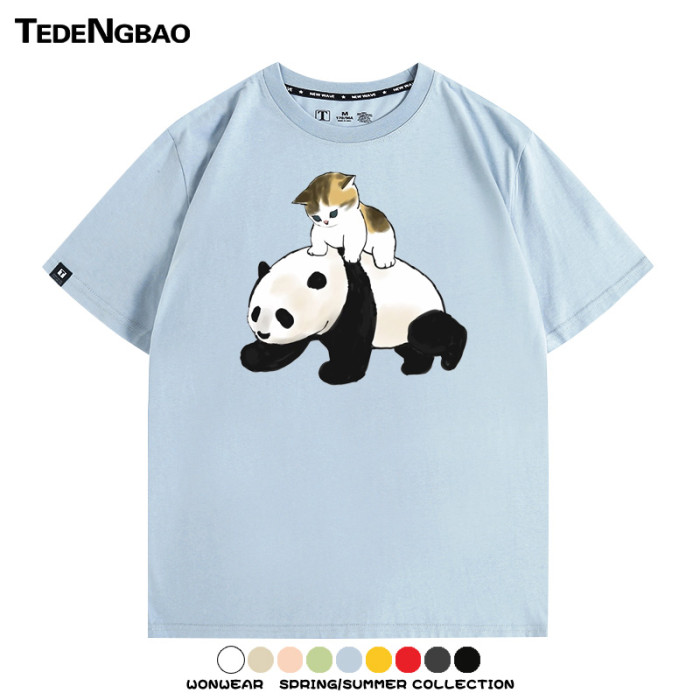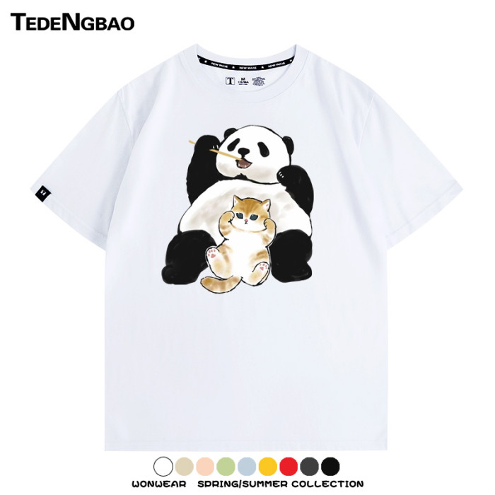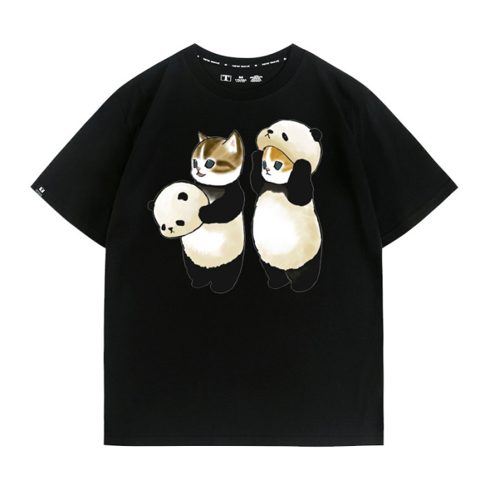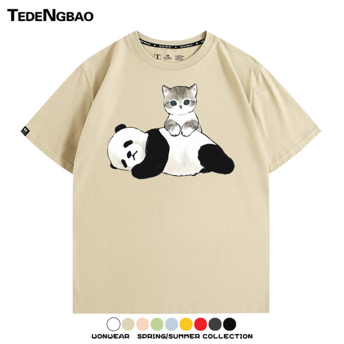 可愛貓咪熊貓印花純棉短袖上衣服卡通夏季情侶裝青少年半袖男t恤