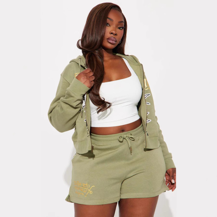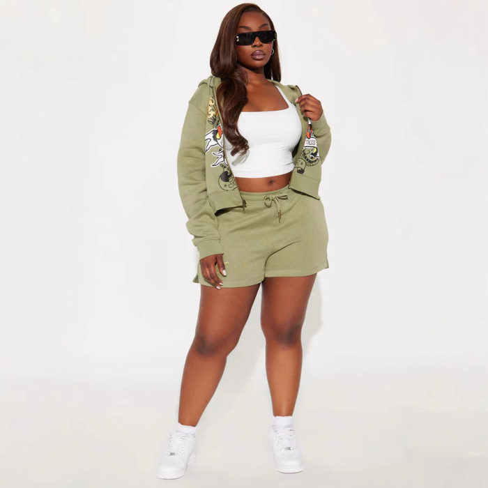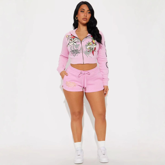 歐美時尚街頭休閒舒適彩繪拉鍊連帽定位印花兩件套女裝