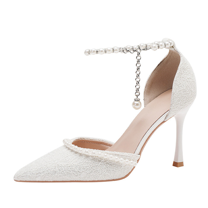 珍珠一字帶蕾絲面中空高跟鞋女細跟尖頭新娘伴娘白色婚禮旗袍搭配