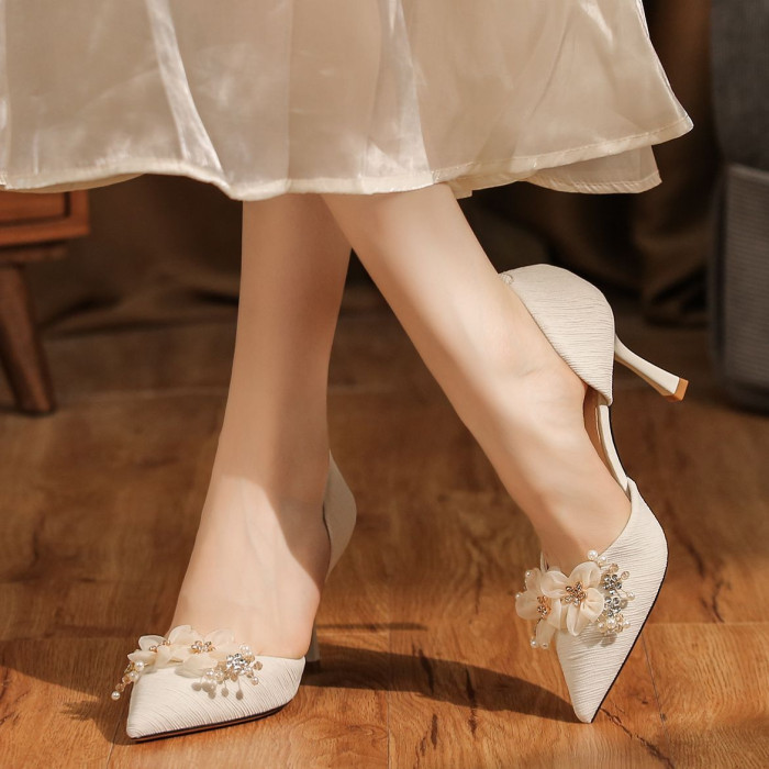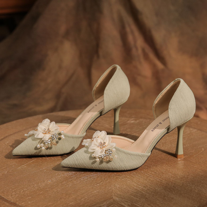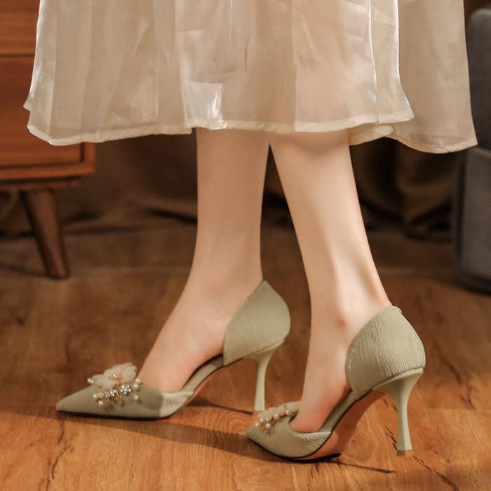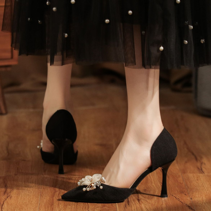 6693A-003貼花小香風中空細跟布面職業鞋簡約通勤高跟鞋女鞋百搭