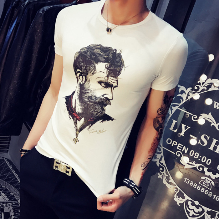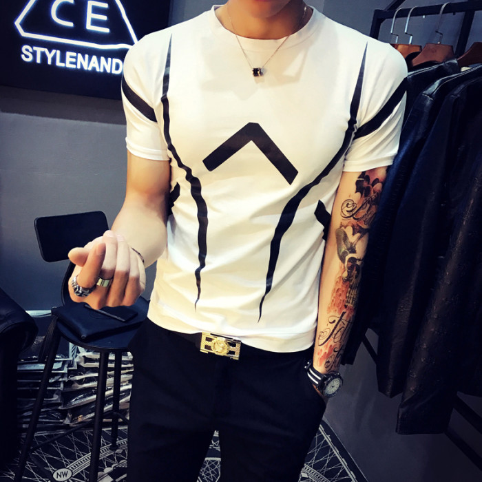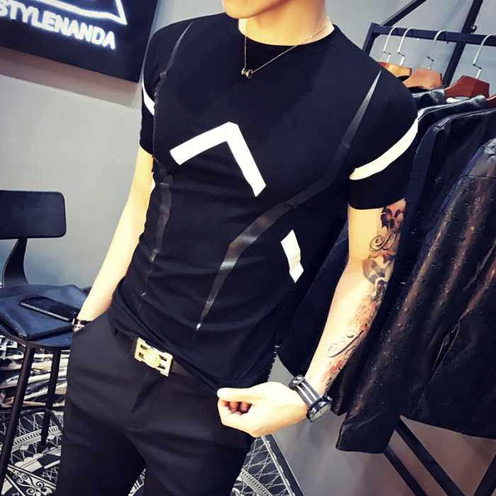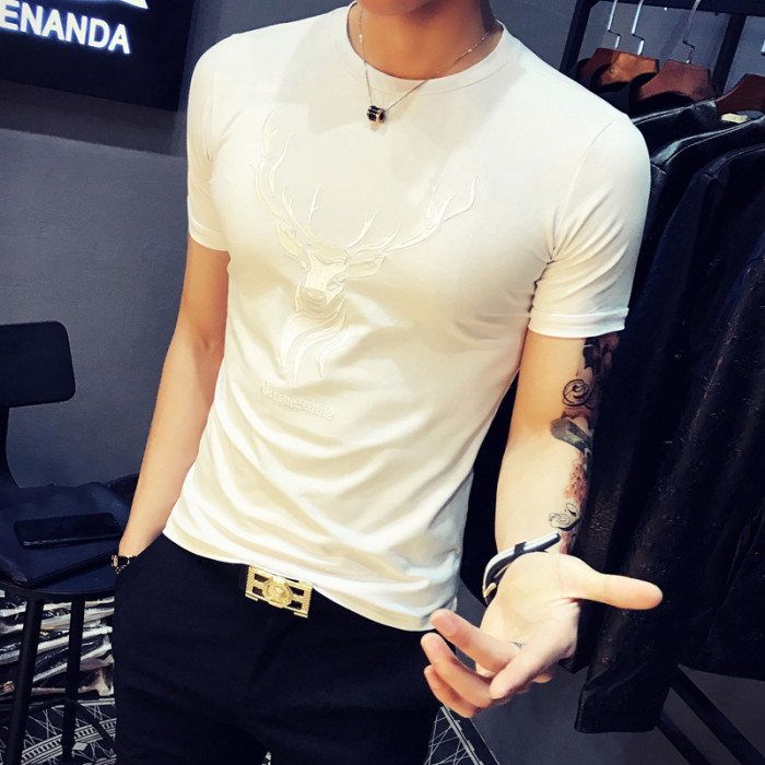 香港夏季鹿頭短袖男T恤韓版個性潮修身半袖黑色緊身社會小夥體恤