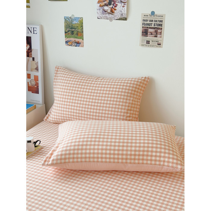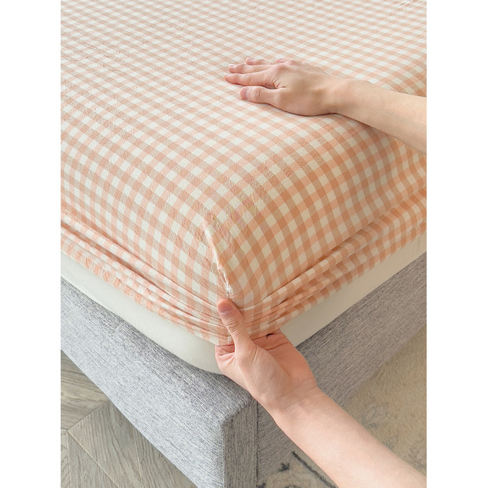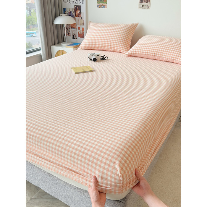 北歐粉小格全棉水洗棉床笠單件100純棉全包床單人床罩枕套2三件套