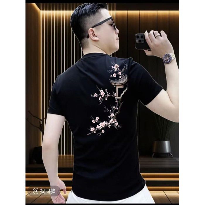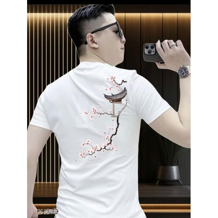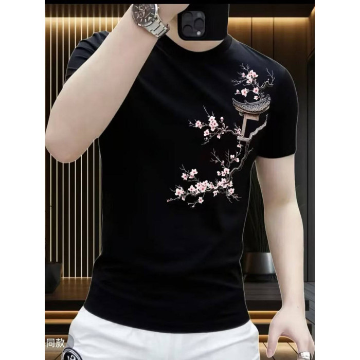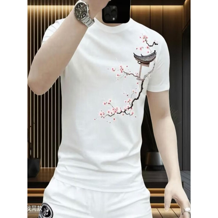 夏季新款純棉短袖男t恤時尚休閒百搭潮牌梅花印花圓領體恤上衣服