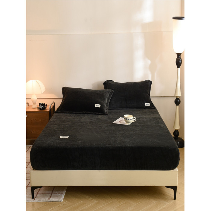 牛奶絨床單單件~秋冬季加厚加絨床笠三件套 珊瑚絨法萊絨毯子黑色