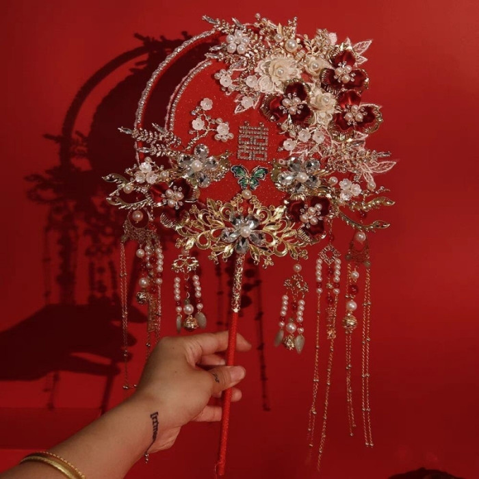 團扇結婚新娘秀禾diy材料包中式出嫁喜扇明製手工婚扇子成品雙面