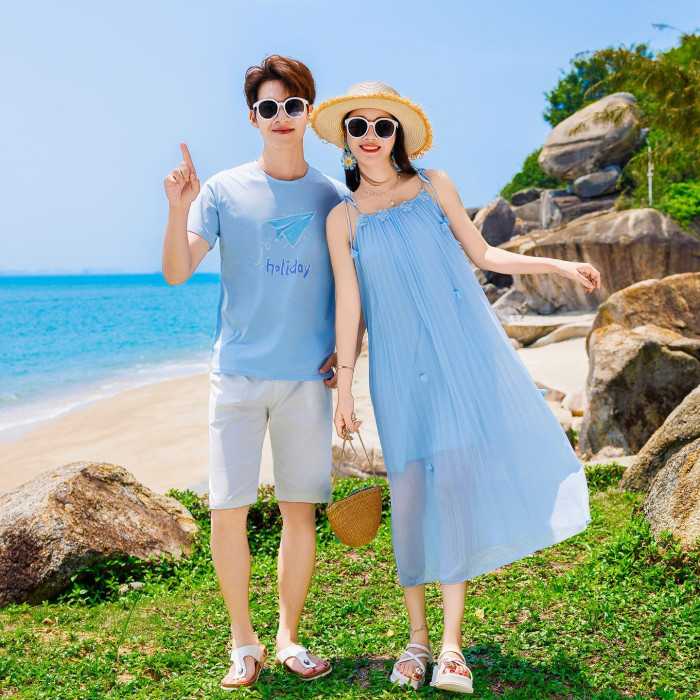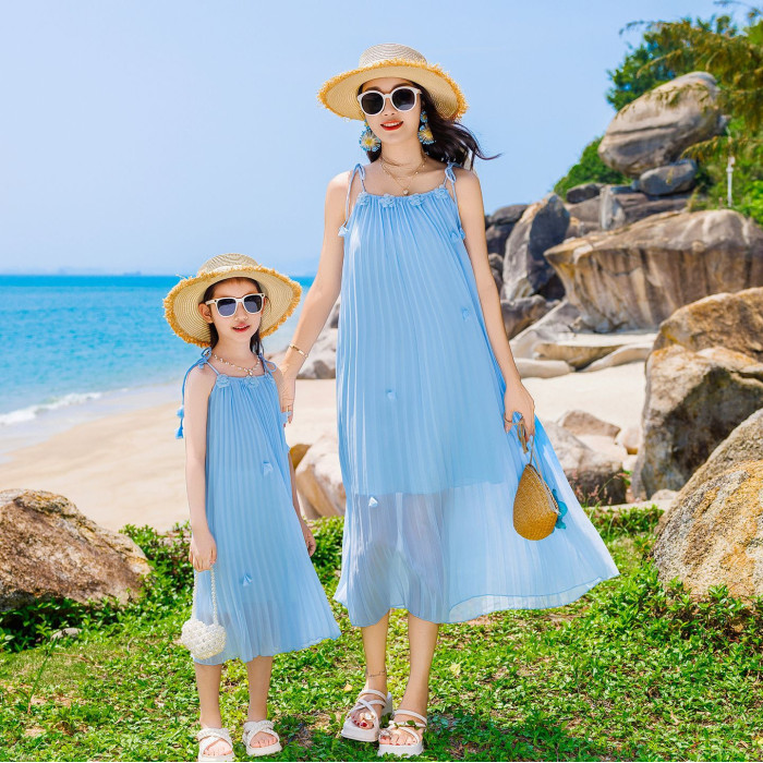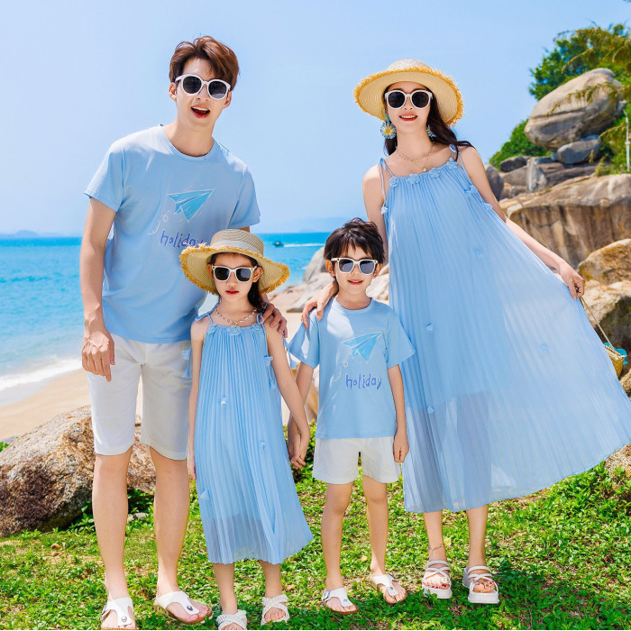2025夏季新款兩件套純色女裙親子裝沙灘款一家四口夏季休閒套裝