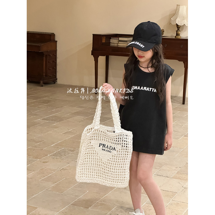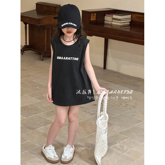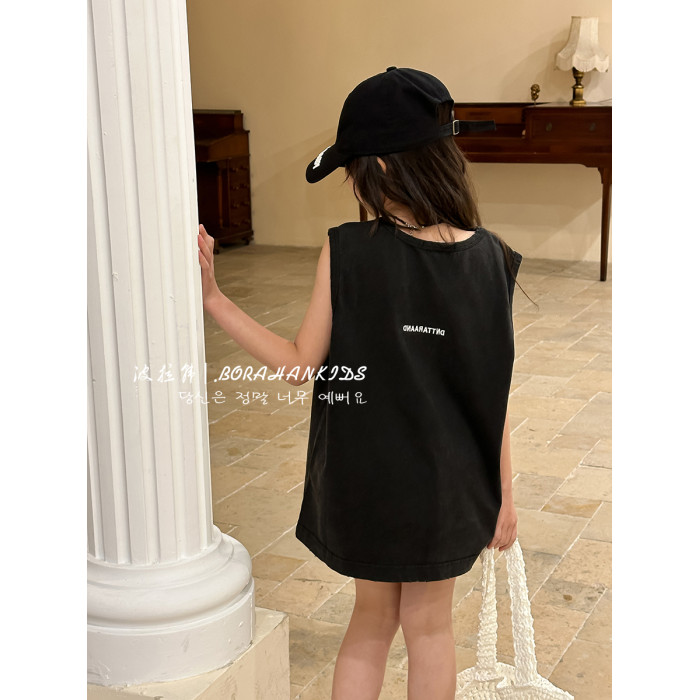 女童無袖背心復古2025夏裝男童寬松T恤中大童運動上衣兒童做舊t恤
