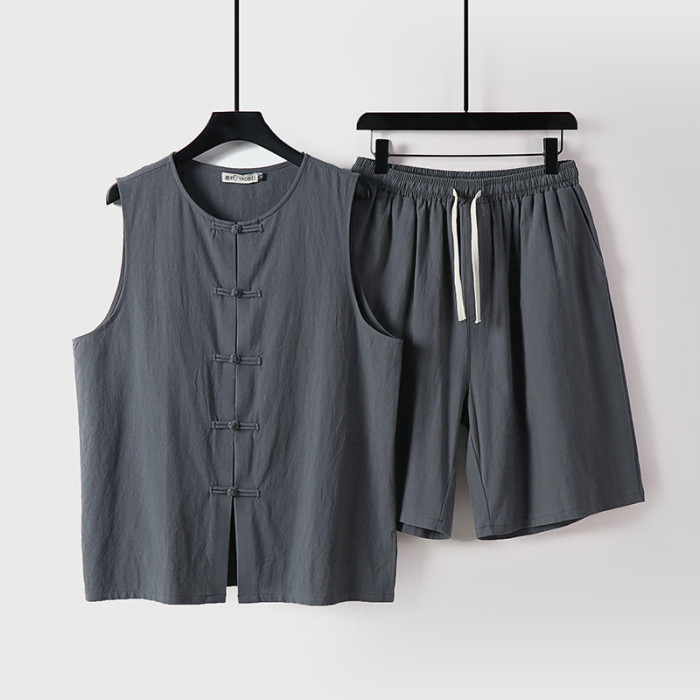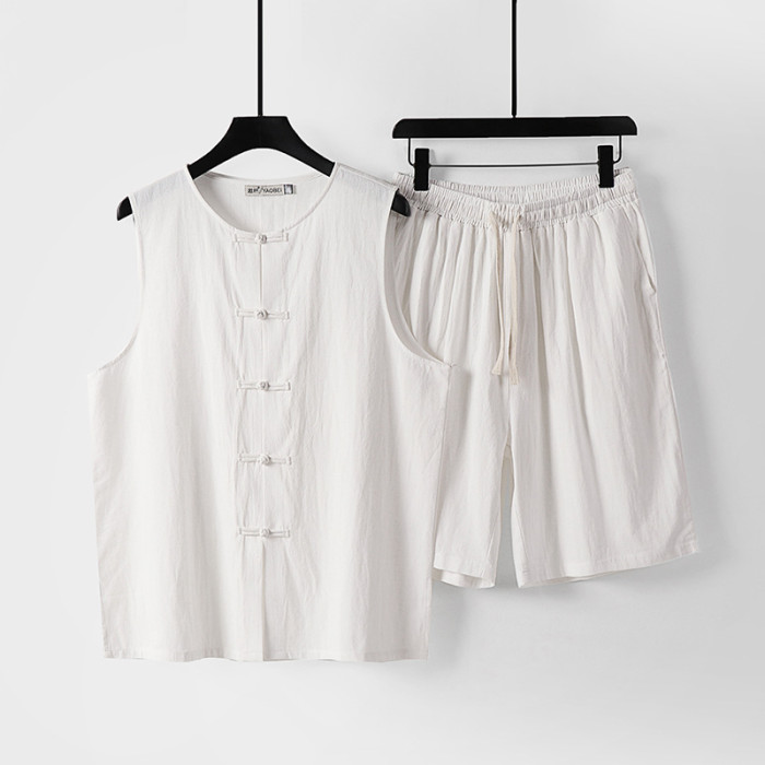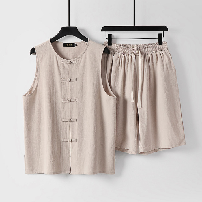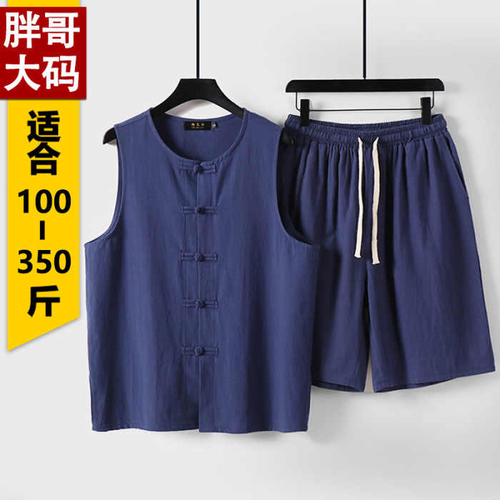 男夏棉麻盤釦汗背心短褲唐裝套裝加肥加大碼胖子佬無袖t恤兩件套
