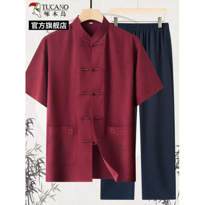 啄木鳥中老年人唐裝爸爸裝夏季短袖冰絲套裝風男裝爺爺衣服C