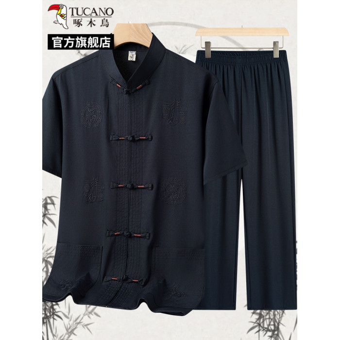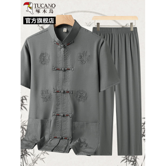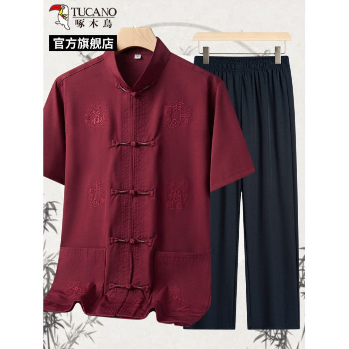 啄木鳥唐裝男夏季中老年襯衫套裝爸爸夏裝風短袖爺爺襯衣服C