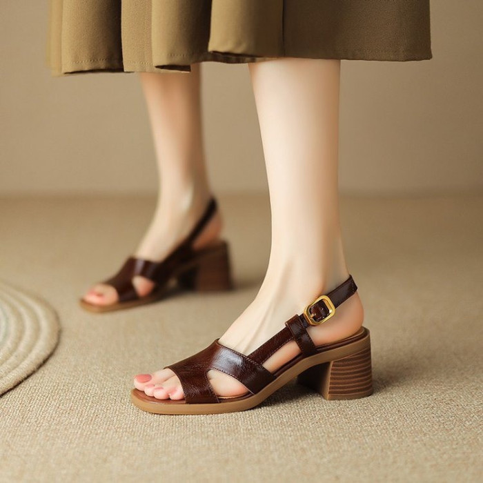 方頭露趾涼鞋女夏新款休閒通勤粗高跟鞋