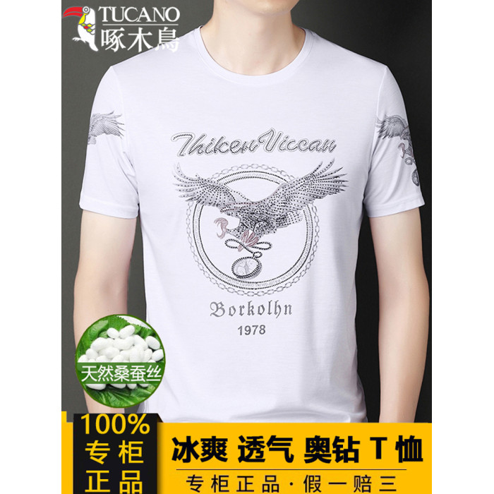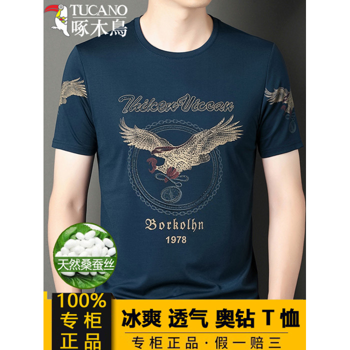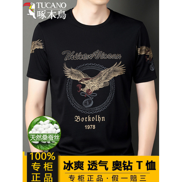 啄木鳥男T恤短袖夏季新款冰絲透氣奧鑽半袖汗衫爸爸圓領寬松上衣