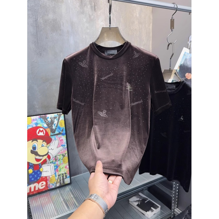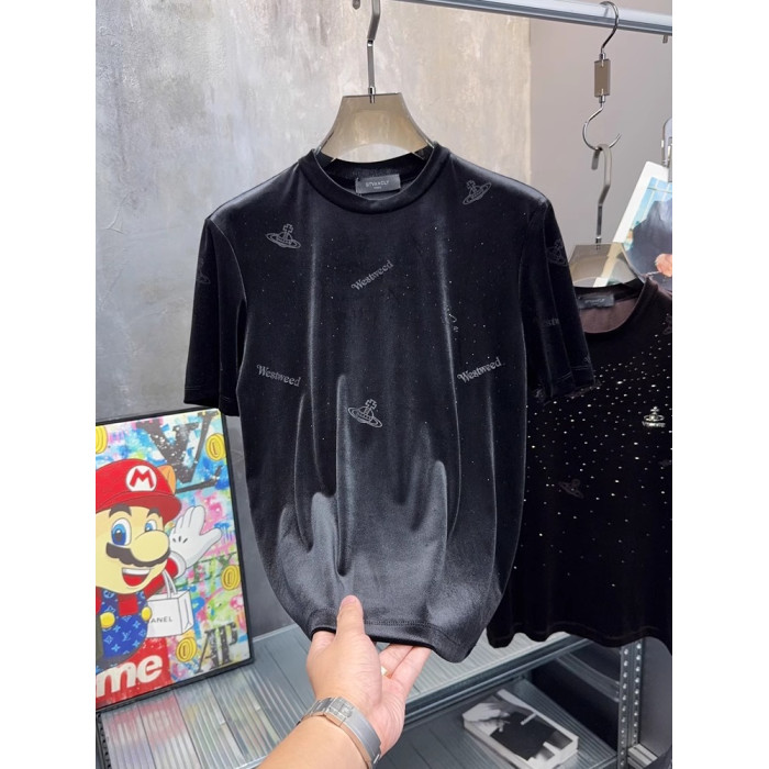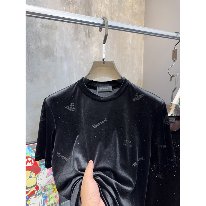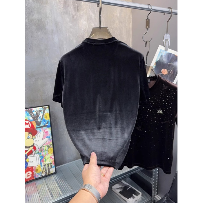 秋冬新款品質輕奢歐貨個性金絲絨壓花字母燙鑽加厚短袖打底男T恤