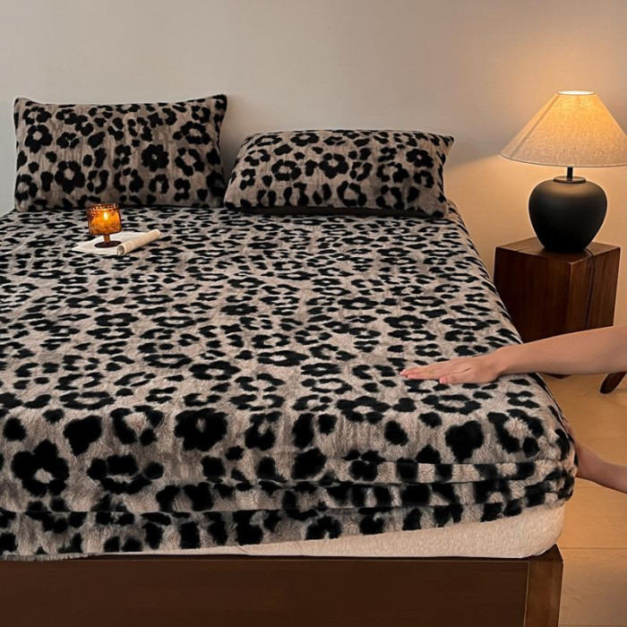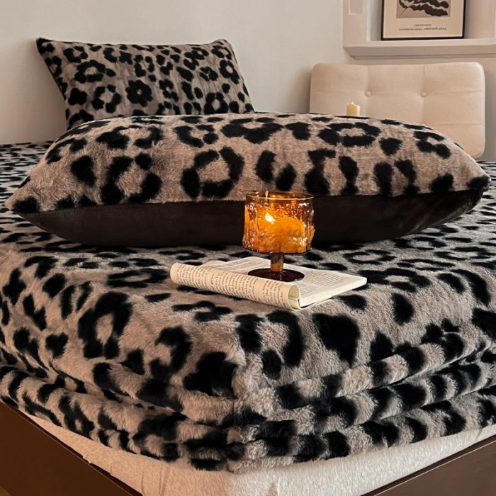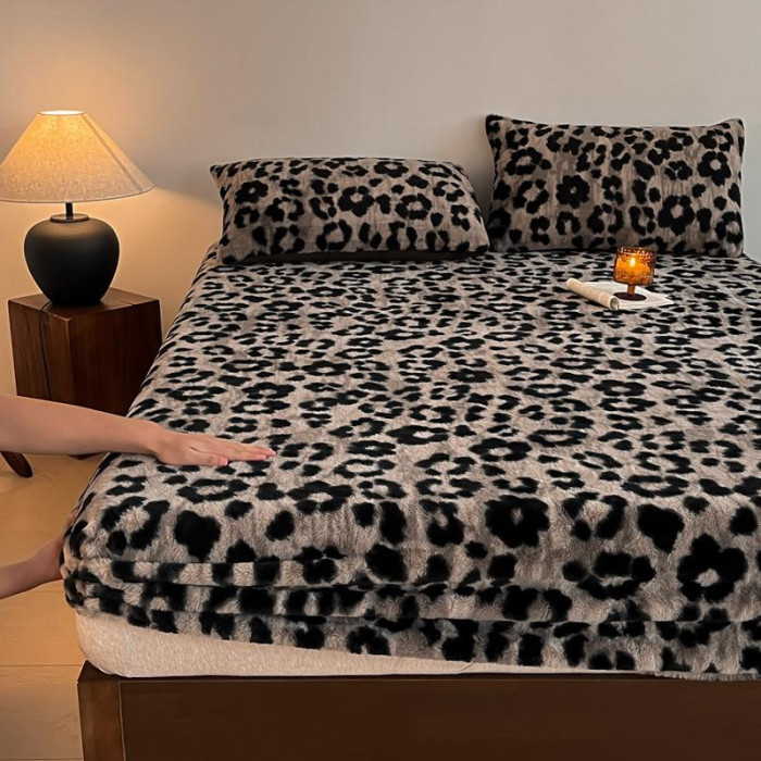 A類冬季加厚兔絨床笠單件保暖親膚豹紋床罩牛奶絨黑色1.8米三件套