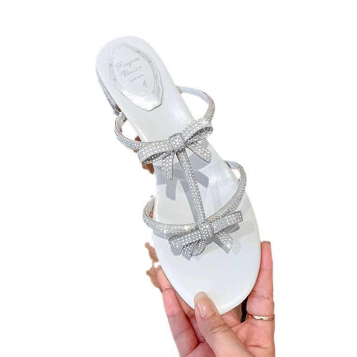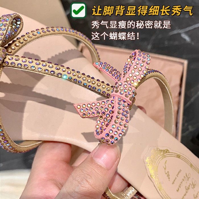 rc水鑽蝴蝶結涼鞋女2025年夏季新款仙女風夾趾外穿拖鞋粗跟涼拖鞋