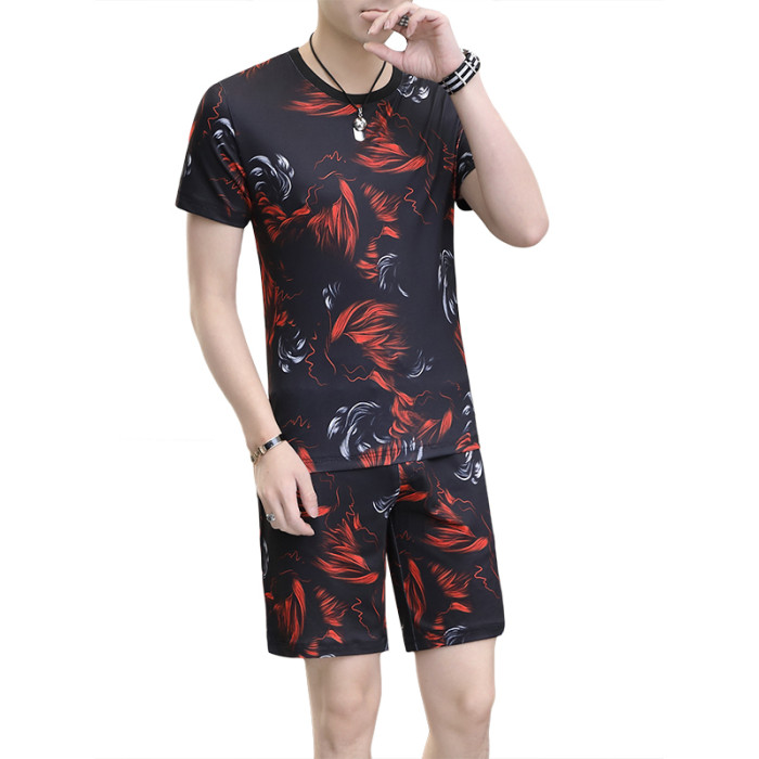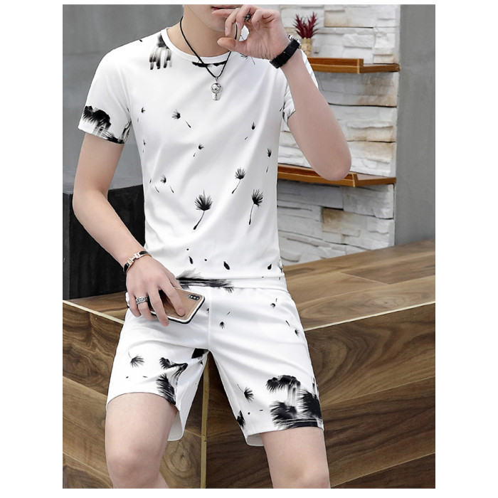 短袖男t恤夏季簡約兩件套韓版修身五分褲青年潮流套裝印花休閒