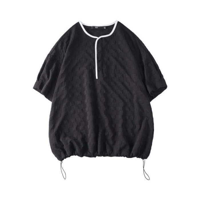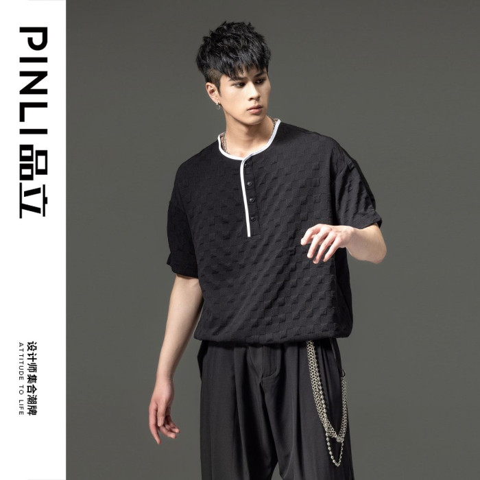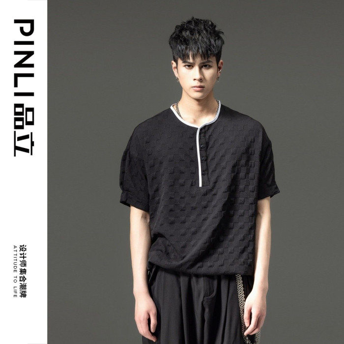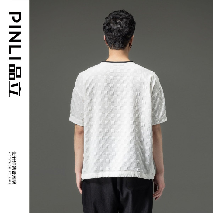 PINLI品立男t恤2023夏季新款潮流領口設計格子提花男士半袖體恤男