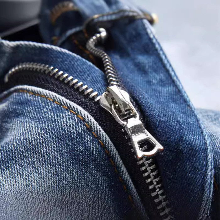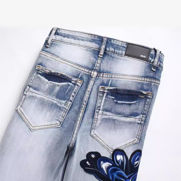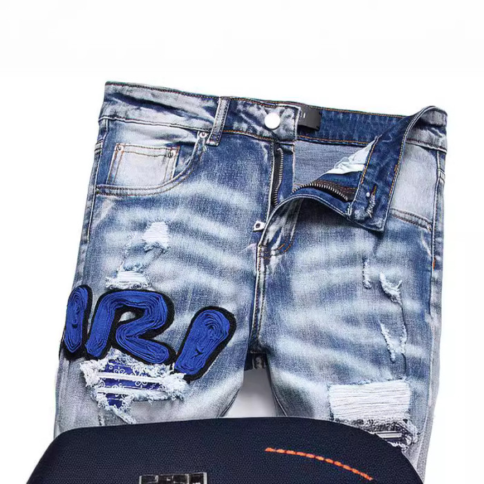 春秋新款風格藍色破洞貼布刺綉彈力小腳男式牛仔褲潮3606-1