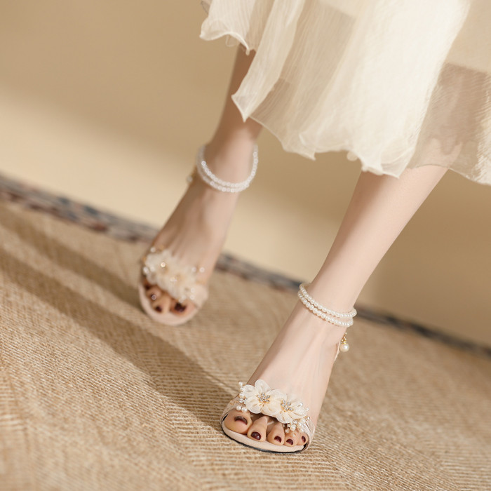 2024夏季新款珍珠一字釦高跟涼鞋大碼加肥加寬花朵淺口女鞋仙女風