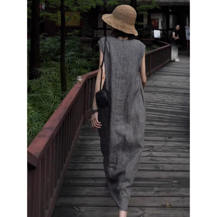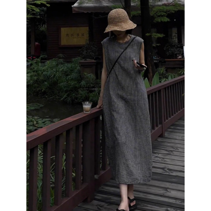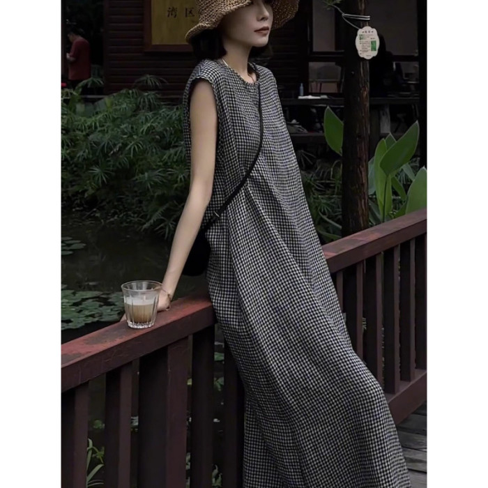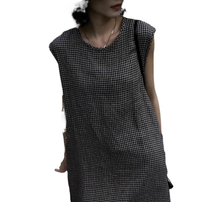 日系慵懶感黑白格子字背心裙女春夏新款簡約休閒連衣裙