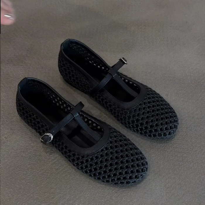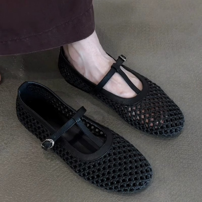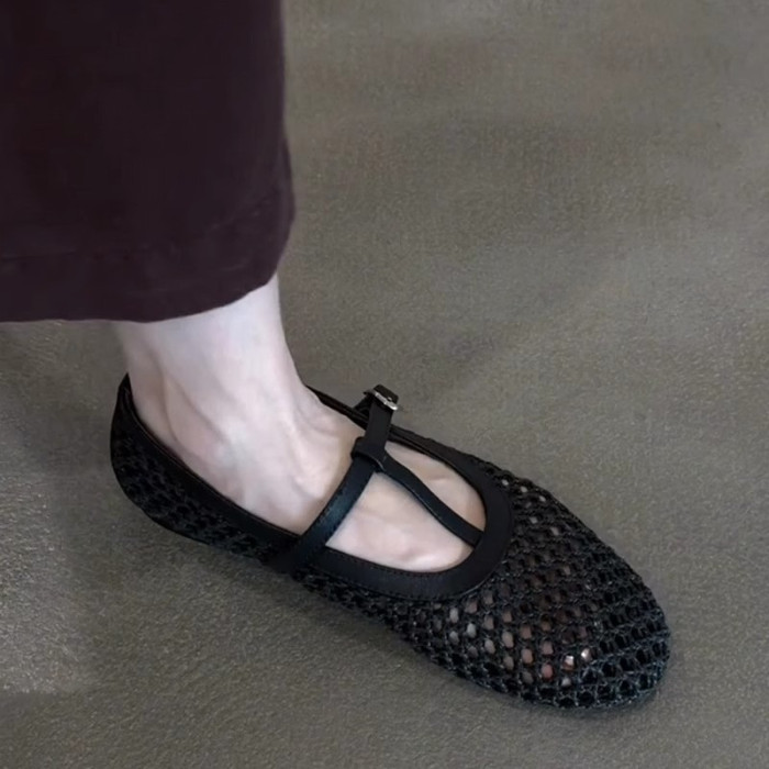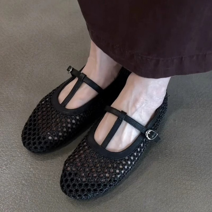 羊皮版~法式復古編織鏤空T字釦帶瑪麗珍鞋女氣質圓頭平底淺口單鞋