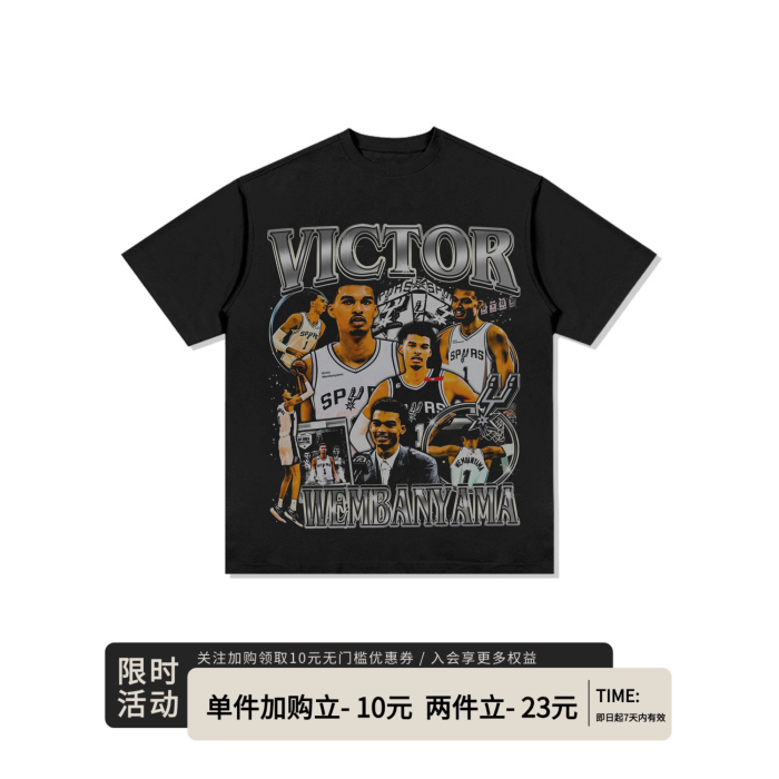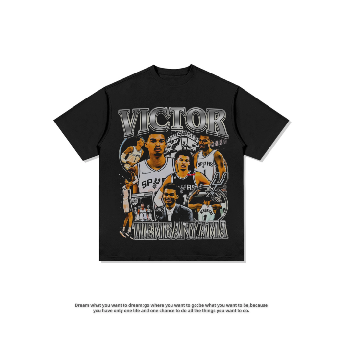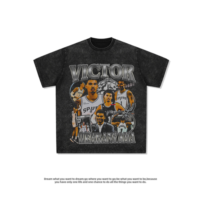 文班亞馬Wembanyama印花美式寬松復古做舊短袖重磅休閒純棉男T恤