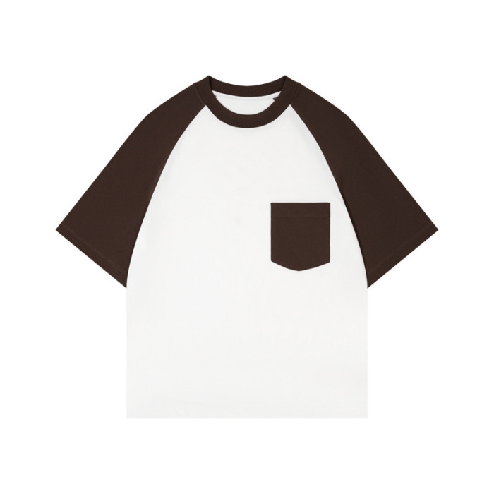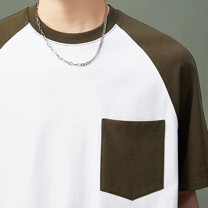 300g純棉插肩撞色短袖春夏秋新款撞色百搭女上衣口袋設計感男t恤