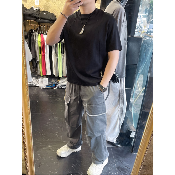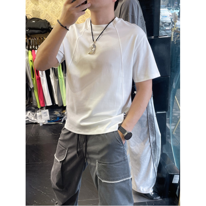 2025夏季男士純色個性裁剪短袖T恤寬松版型棉簡約休閒刺綉男T恤夏