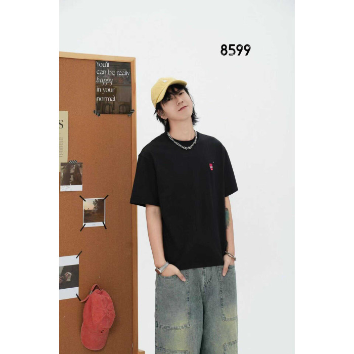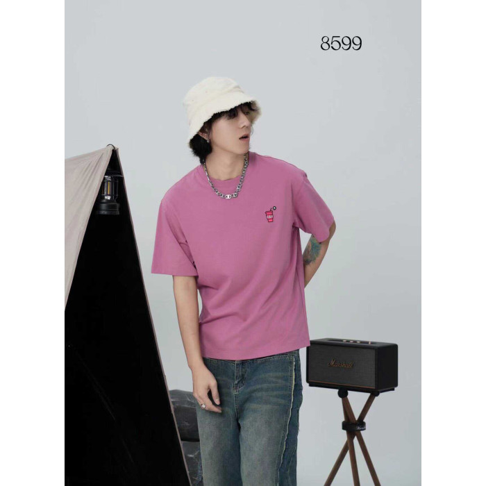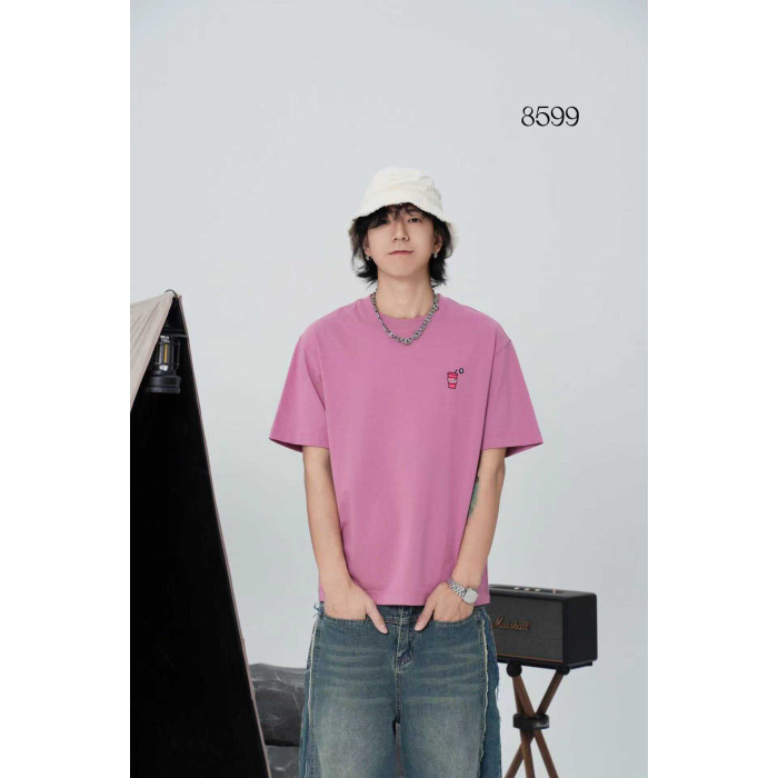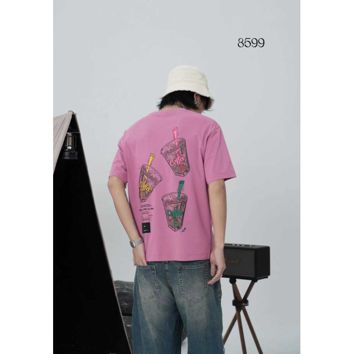 2024寬松短袖男t恤時尚休閒百搭拼色咖啡杯印花圓領體恤