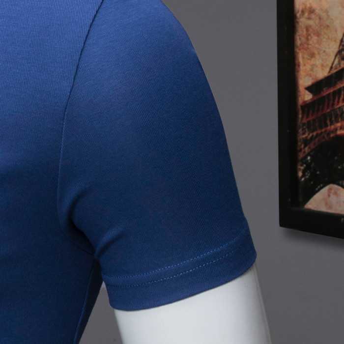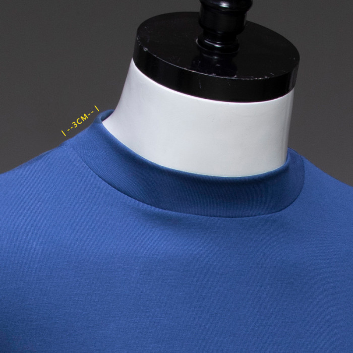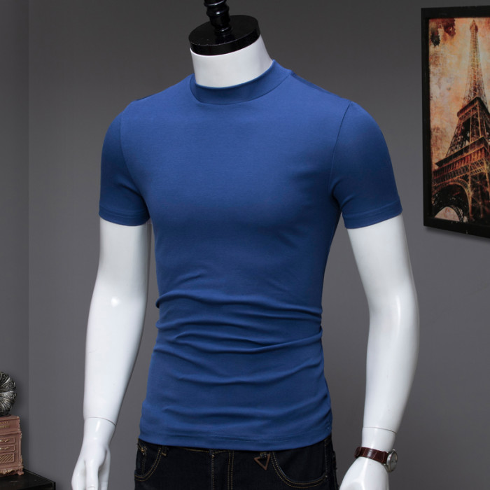 3cm藍色小高領短袖男T恤中領針織羅紋純棉半高領半袖潮