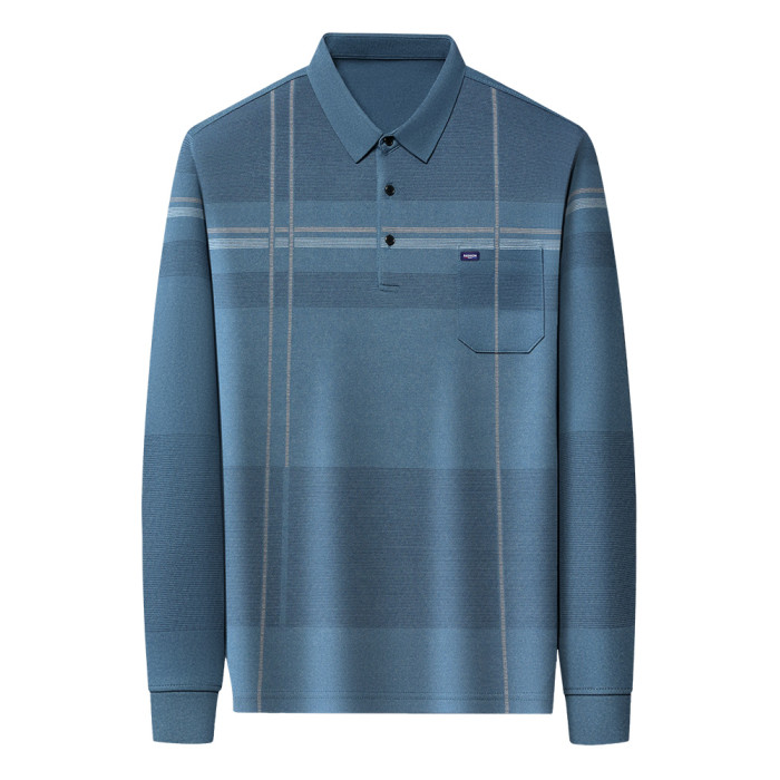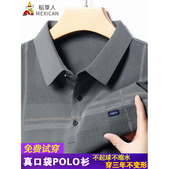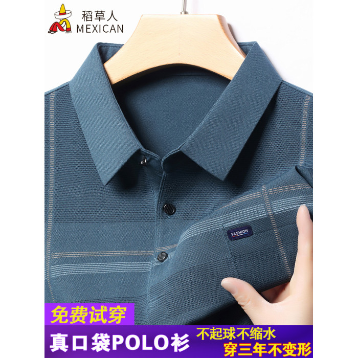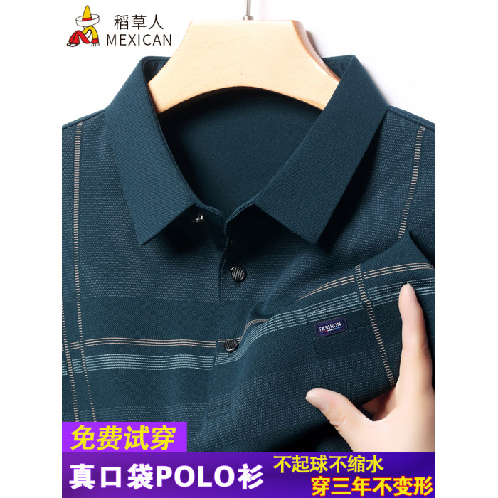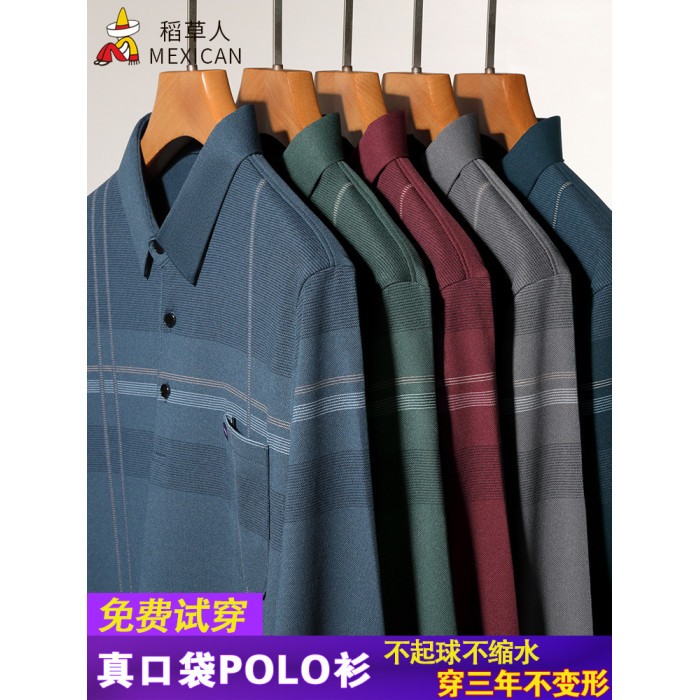 稻草人長袖男t恤2025新款春季純棉polo衫中年爸爸裝真口袋打底衫