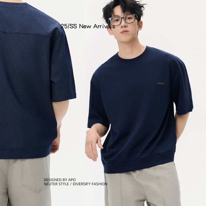 APO男裝 |夏季短袖男T恤潮牌拼接牛仔寬松休閒圓領內搭上衣打底衫