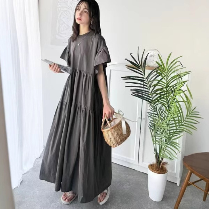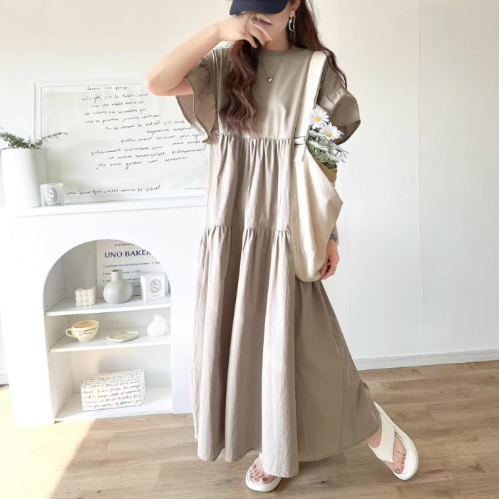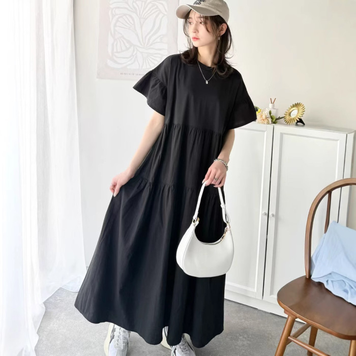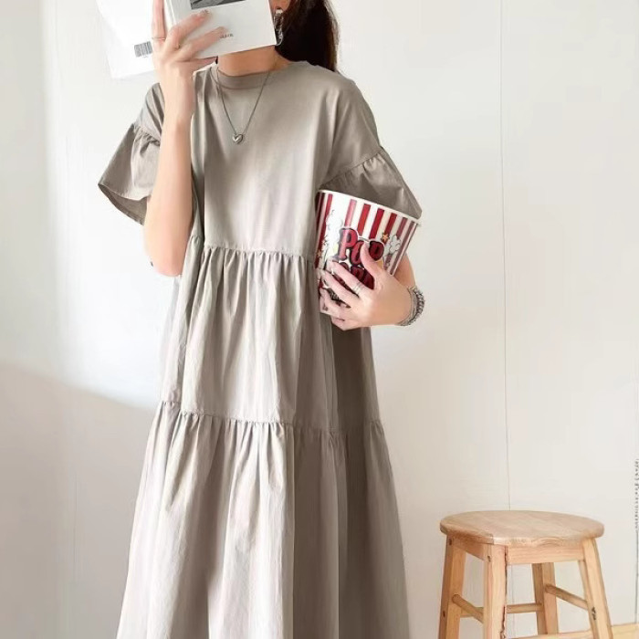 2025日韓休閒圓領拼接褶皺荷葉袖連衣裙