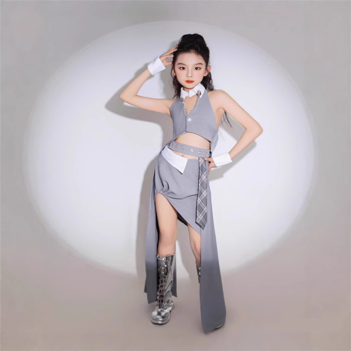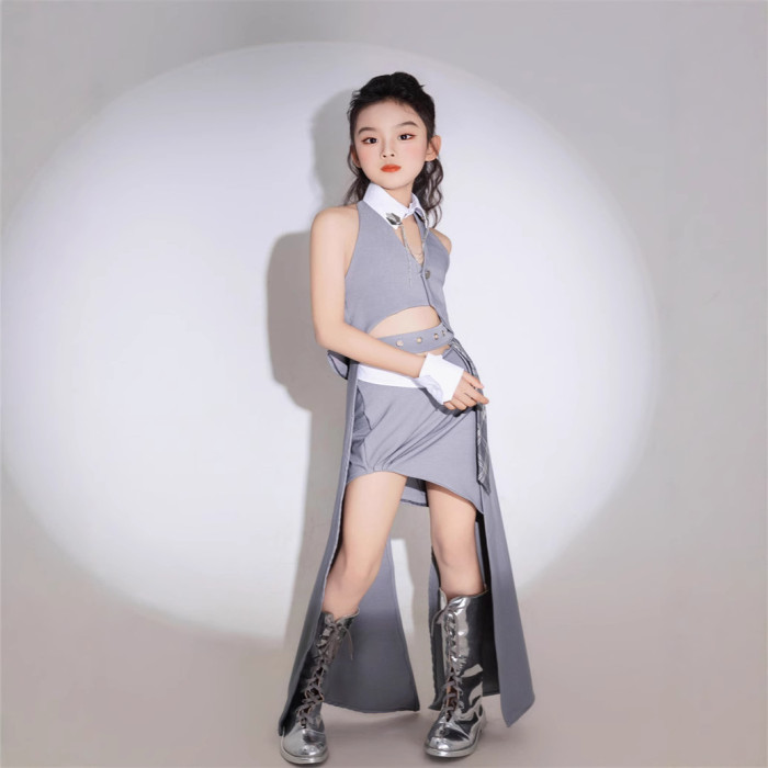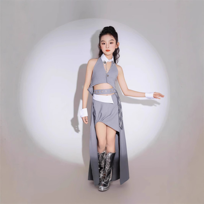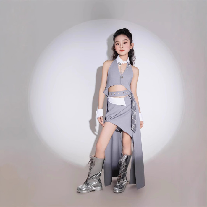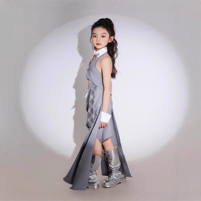灰色掛脖西裝套裙包含:掛脖上衣(後背松緊)+裙子+側拖腰帶+襯衫假領(含流蘇領針)+襯衫袖口(不要袖口少5,不要襯衫假領少5)