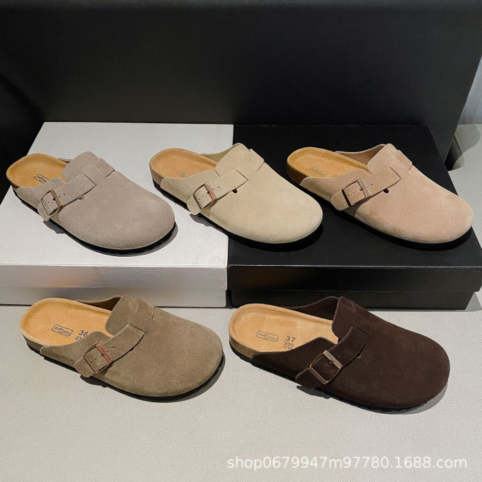 真皮勃肯男女同款半拖鞋軟木平底包頭博肯鞋一腳蹬復古厚底大頭鞋