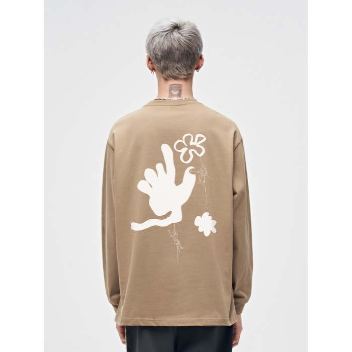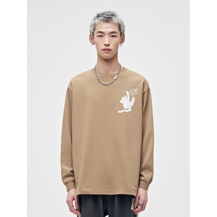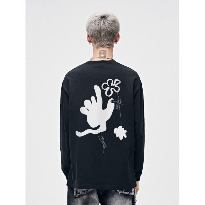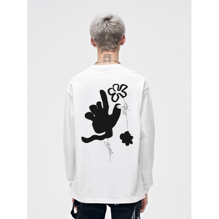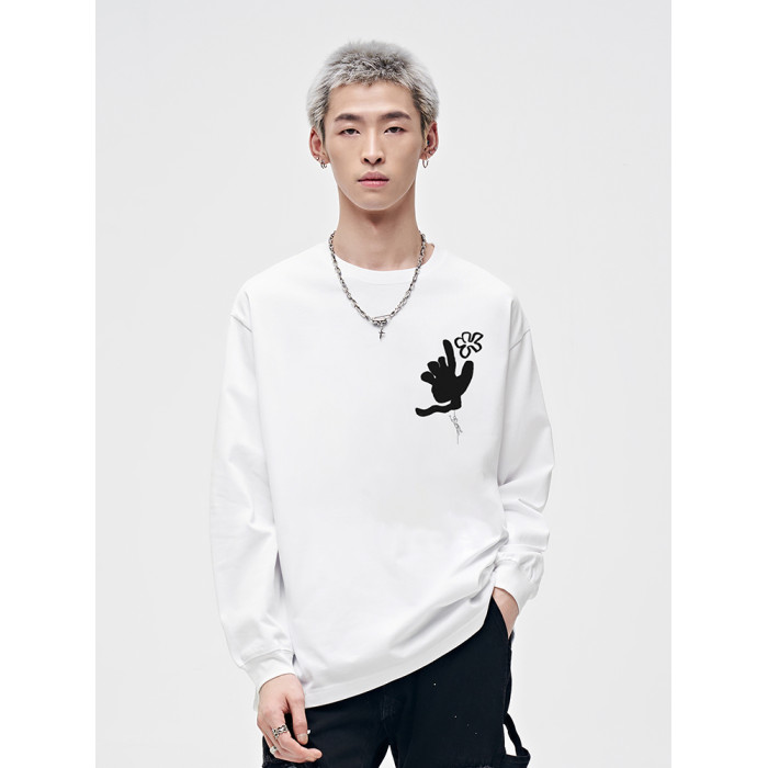 山小川潮牌圓領長袖男t恤秋冬美式寬松純棉大學生白色內搭打底衫